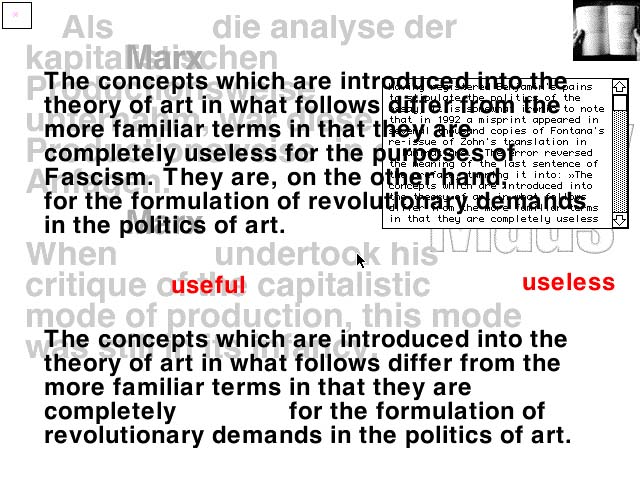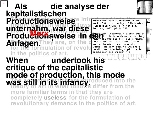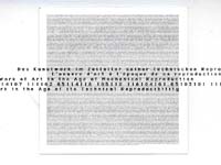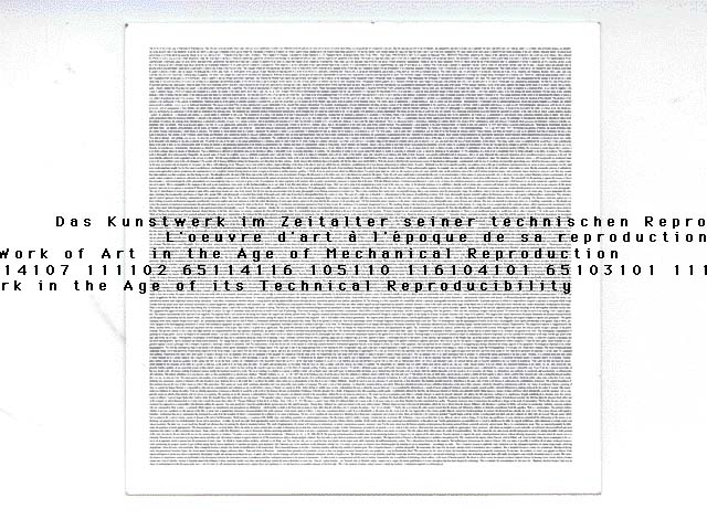 CD-ROM/website takes as its starting point Walter Benjamin's artwork essay of 1935/36. The project aims to transform its textual argument to the specifics of the form in which it now takes shape as electronic data; to comment both critically and creatively on contemporary modes of 'technical reproducibility' by using the essay itself as the object. The central analogy for this process is one of translation; from the specific technical, cultural and historical context of its production to the present moment.
