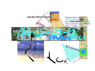 "The piece 'Information Woman' draws itself, becoming alive with color as thoughts, images, and sounds segue in and out of phase. The piece is about spending a moment (a second? four minutes? an eternity?) in someone else's head. Thematically it's an exploration of how we have become extensions of our brains. The body is disappearing and being replaced by our thoughts in many ways. The jumble of sounds ('I've got my mac to think about,' 'There are so many damn trees,' the wolf whistle which comes from nowhere) serve to build a cacophonic momentum which culminates in and is released by the soothing sound of breaking waves. Surrounded by white noise, Information Woman integrates image and sound into her own thoughts. Moving between extroversion and introversion in an instant, she exists as an apparition in cyberspace, simultaneously existing in many places at once. In the same way that she pulls in sounds from the 'outside world' to feed her introspection, the viewer --- awash in sound and image - is lulled into private thoughts and pulled back into the piece. 'The beach in her elbow' represents our ability to live apart from real time in thought while in 'reality' our bodies remain locked in the space/time continuum we call home."