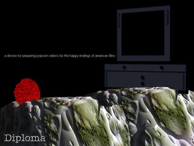 excerpts: [...] [Arad - arrival] on his returning into the country, Anghemacht Frei is hurrying to announce his master, Francisc Dittiger, that he is ready to pass his final examination, which will allow him to open a workshop with acme apparel and, for the beginning, an apprentice. the master warns Anghemacht Frei that the examination consists of three: a dinner for the entire commission; achieving a masterpiece susceptible of bringing fresh air in the field; and, last but not least, to marry his beloved one. Anghemacht Frei's answers: being a natural born cook, it wasn't difficult for him to prepare a menu based on beef, veal and pork. the masterpiece comprises two panels: a short digital reconstruction of his trip; a popcorn rations making device, for the happy endings of american films. with a voice submerged by emotion, Constantza Okiry accepted to tie forever her destiny to our youth's. the young couple will go for honeymoon at Debelagora. but this is another story, another cd-rom. [diploma] we, the superior master of the honorable guild of scanarators from the privileged town of Arad, document & acknowledge by the power of the hereby letter, that the young Anghemacht Frei appeared in front of us, soliciting on this occasion a credible patent incurring from the learning of the trade of scanarator. we grant this certificate without any reservation. acknowledging his solicitation as rightful, we certify that the named person was an apprentice, then an intermediate apprentice at our Beloved Lord and Master Francisc Dittiger. and by consequence of achieving of the masterpiece entitled a device for preparing popcorn rations for the happy endings of american films, we declare him a master, observing that all along his apprenticeship and, also, all along his wandering trip, according to the enclosed book, Anghemacht Frei was a respectful man, honest and industrious, which enjoys us and thus we apply the great seal of our honorable guild. / the superior master of the honorable guild of scanarators:Toomnail Pop / the members of the masterpiece's accrediting commission: Anton Finster, John Cartridge, Edmund Kolb |